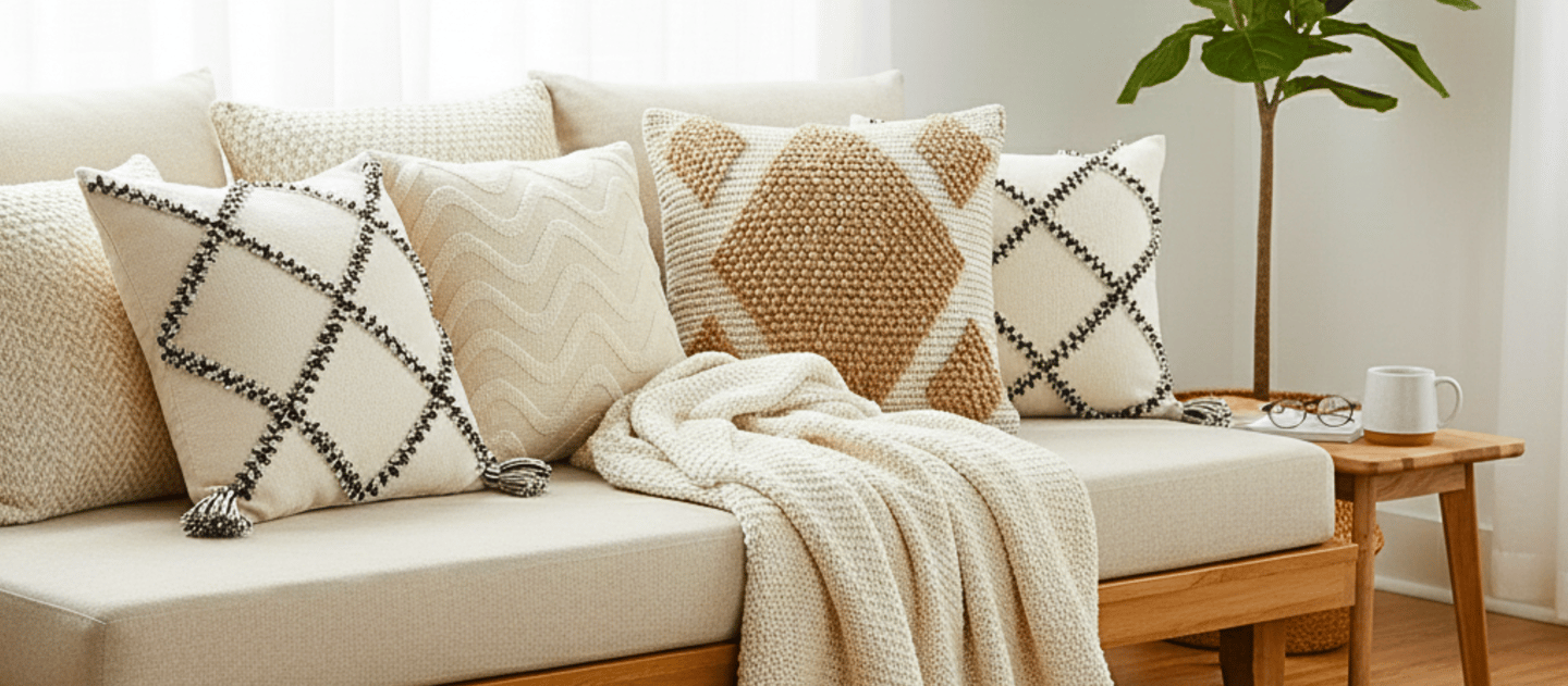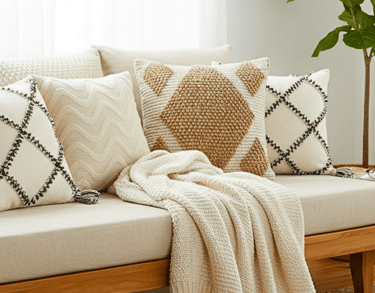 Our cushions are more than décor — they are a blend of craftsmanship, comfort, and conscious living. From recycled cotton to PET fibers, every cushion reflects our commitment to style and sustainability.